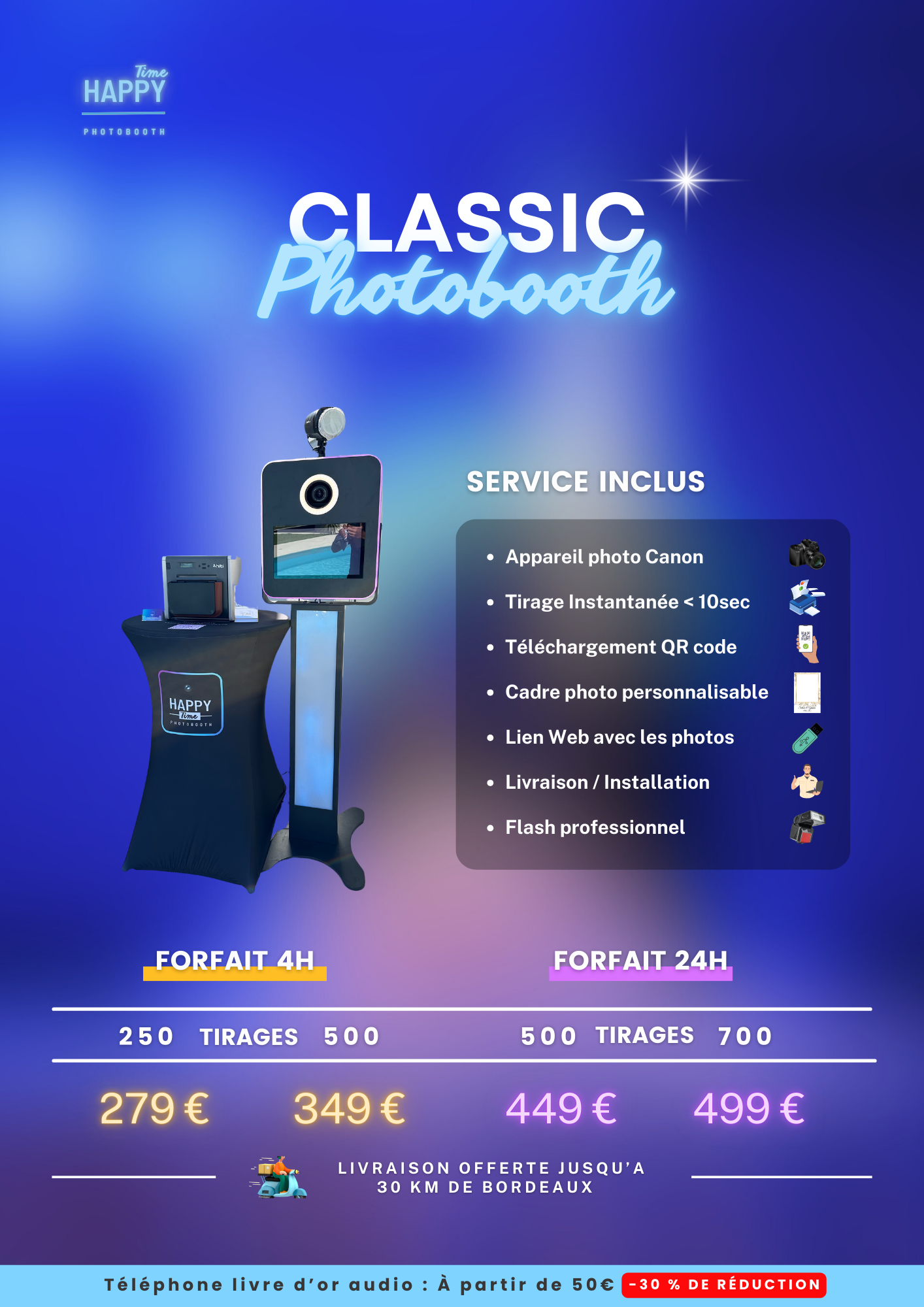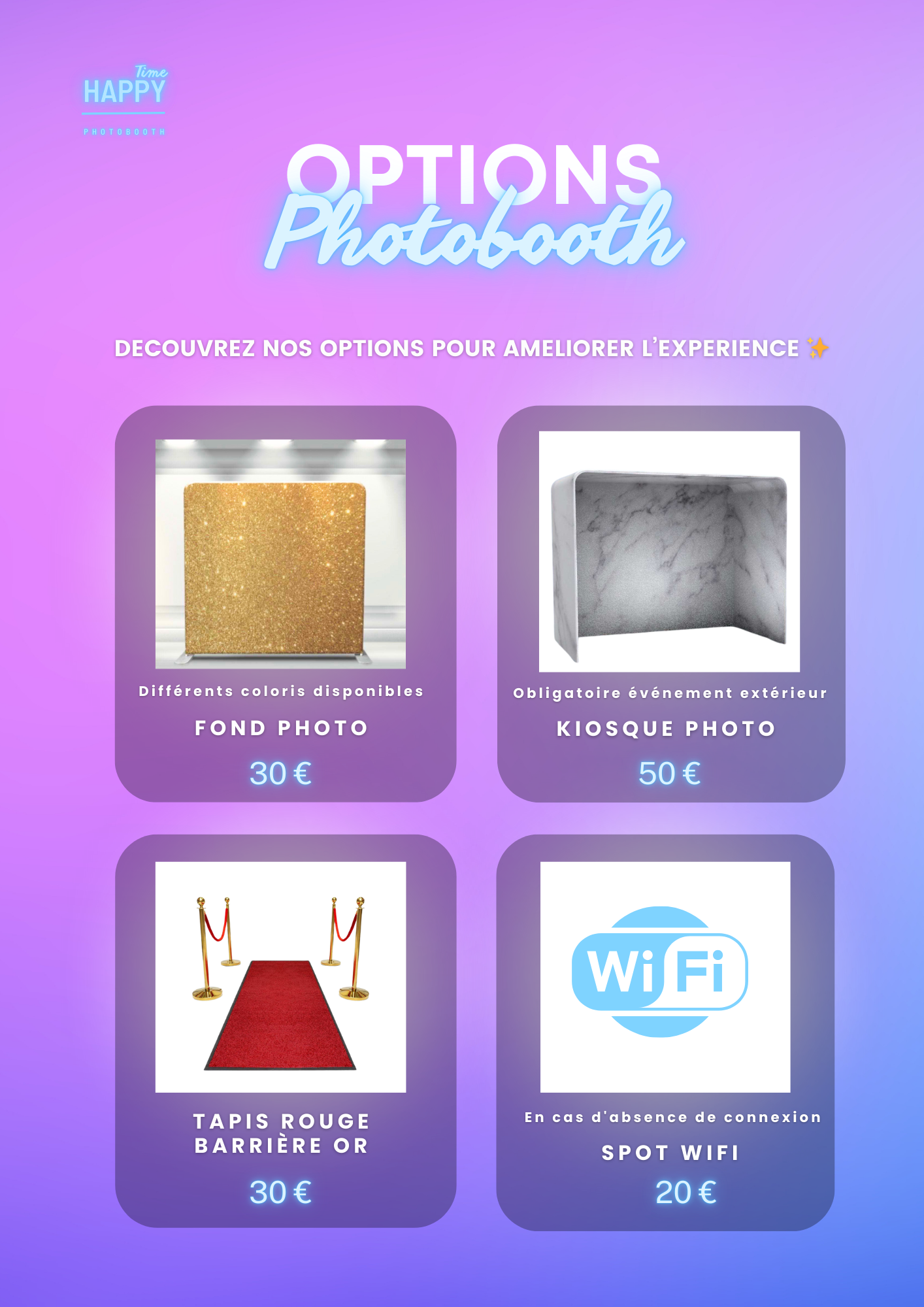 Nous mettons à votre disposition un tableau comparatif des différents photobooths disponibles chez HappyTime. À vous de choisir celui qui répond le mieux à vos besoins.